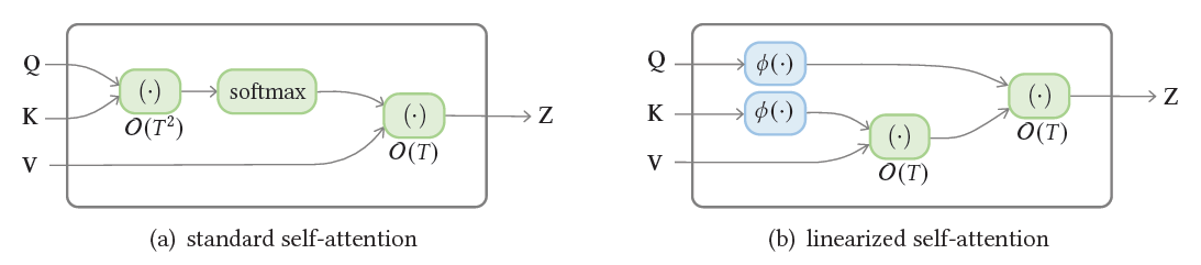 Linearized attention은 matrix $exp(QK^T)$를 $\phi(Q)\phi(K)^T$($\phi$ : feature map)로 대체하고, 위의 그림 (b)처럼 $\phi(Q)(\phi(K)^TV)$의 연산 과정을 거칩니다.